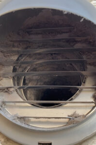 屋外の排気フードにも鳥の羽や埃がびっしり。湿気でカビっぽく固まってるし、これじゃ排気がスムーズにいかず、不完全燃焼のリスクまでありますよね…。