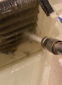 高圧洗浄機と専用工具を使って排水ルートを徹底洗浄し、ドレンポンプの動作もチェック。