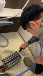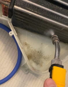 やはり汚れが詰まっておりますね。業務用の洗剤と、高圧洗浄でキレイにしないといけません。