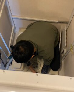 裏側に回っての作業。ドラム式は縦型洗濯機と違って、大変なんですよね。